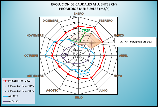 Para el pronóstico hidrológico se considera la programación energética y las previsiones de caudales afluentes (medias diarias) que son realizadas teniendo en cuenta las condiciones actuales y pronósticos disponibles, que además están sujetas a revisión en función de eventuales cambios en las condiciones hidrometeorológicas (además de fenómenos localizados como el viento que se traduce en oleaje) y de las descargas de las Centrales Hidroeléctricas aguas arriba de la CHY.
