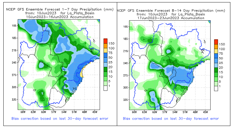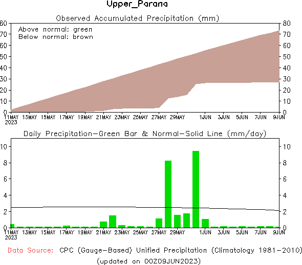 El pronóstico Hidrometeorológico del Centro Climático de referencia indica una tendencia semanal de poca significancia hidrológica en la cuenca de interés para la CHY con dispersión geográfica según sea la fuente consultada. (Ver gráfico Nro. 1).