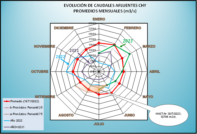 Para el pronóstico hidrológico se considera la programación energética y las previsiones de caudales afluentes (medias diarias) que son realizadas teniendo en cuenta las condiciones actuales y pronósticos disponibles, que además están sujetas a revisión en función de eventuales cambios en las condiciones hidrometeorológicas (además de fenómenos localizados como el viento que se traduce en oleaje) y de las descargas de las Centrales Hidroeléctricas aguas arriba de la CHY.