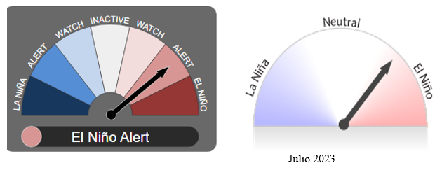 La Perspectiva ENSO está en Alerta El Niño. Cuando los criterios de Alerta de El Niño se han cumplido en el pasado, un evento de El Niño se ha desarrollado alrededor del 70% del tiempo.