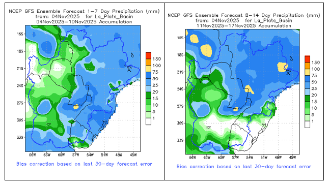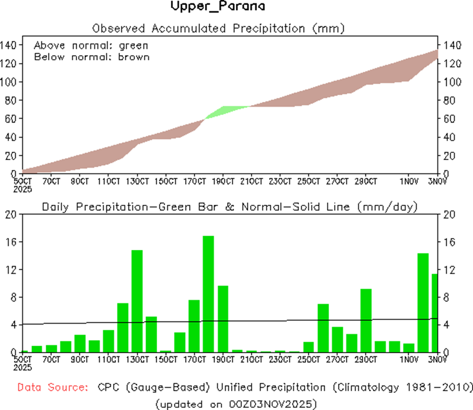 El Niño-Oscilación del Sur (ENOS) se mantiene neutral. El último valor relativo del índice de TSM de Niño3.4 para la semana que finalizó el 12 de octubre de 2025 fue de -0,79 °C. En las dos semanas anteriores, el índice de Niño3.4 cayó por debajo de -0,8 °C. Los valores entre -0,8 °C y +0,8 °C se consideran neutrales respecto al ENOS, mientras que los valores sostenidos por debajo de -0,8 °C (durante al menos tres meses) se consideran indicativos de La Niña.