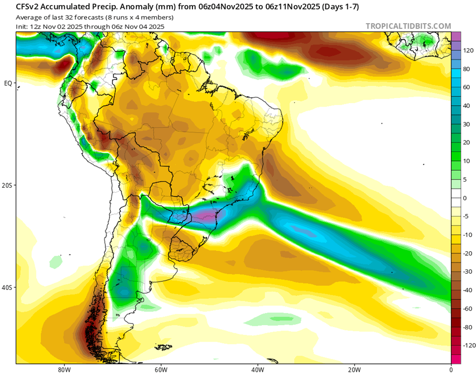 El índice del Modo Anular Sur (SAM) se encuentra en valores neutrales al 11 de octubre. Se prevé que caiga brevemente a valores negativos la próxima semana antes de volver a valores neutrales.