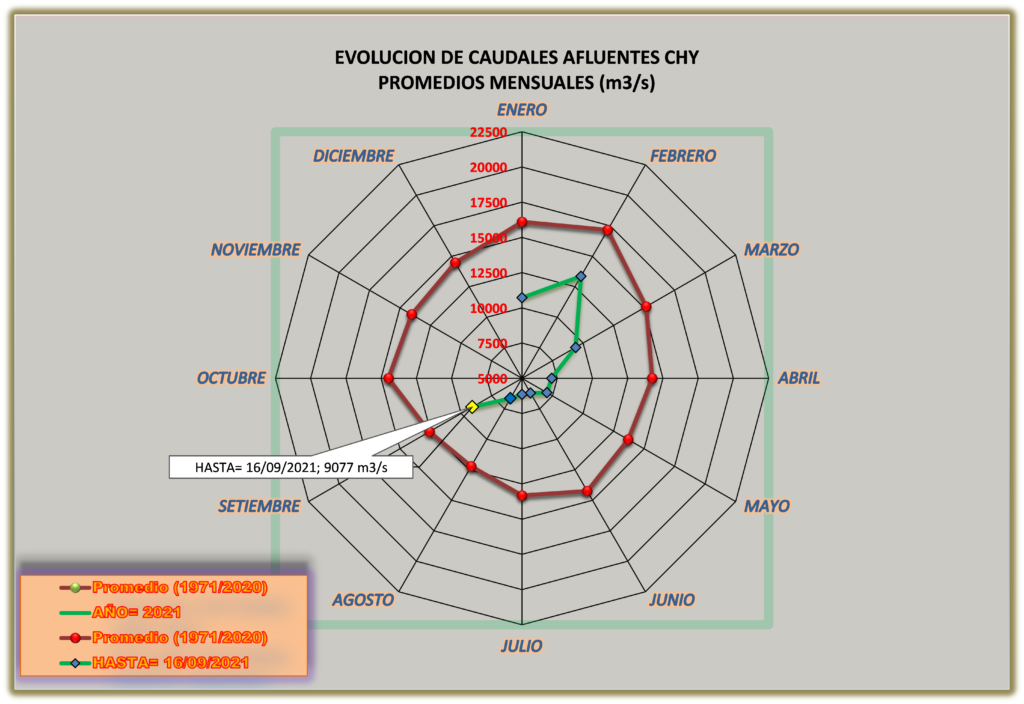 El caudal afluente a la CHY diario, pronosticado para la fecha de hoy es de 8.500 m3/s, y para el día de mañana se espera una afluencia del orden de 7.500 m3/s.
