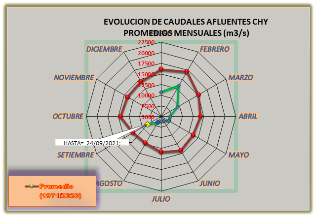 El caudal afluente a la CHY diario, pronosticado para la fecha de hoy es de 6.800 m3/s, y para el día de mañana se espera una afluencia del orden de 6.400 m3/s.