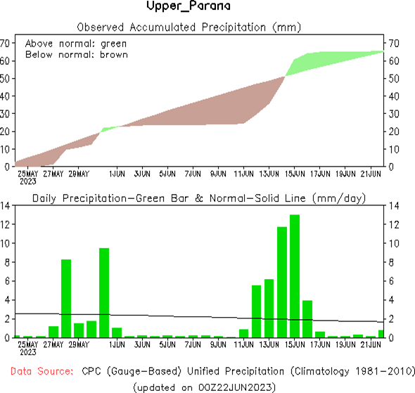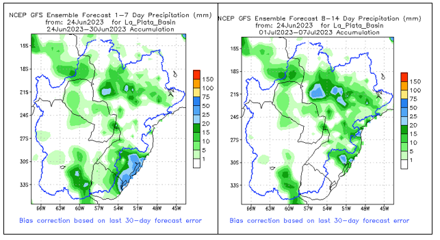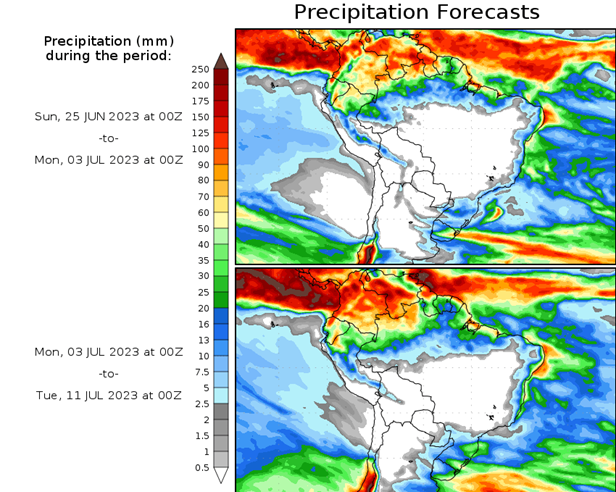 El pronóstico Hidrometeorológico del Centro Climático de referencia indica una tendencia semanal de poca significancia hidrológica en la cuenca de interés para la CHY con dispersión geográfica según sea la fuente consultada. (Ver gráfico Nro. 1).