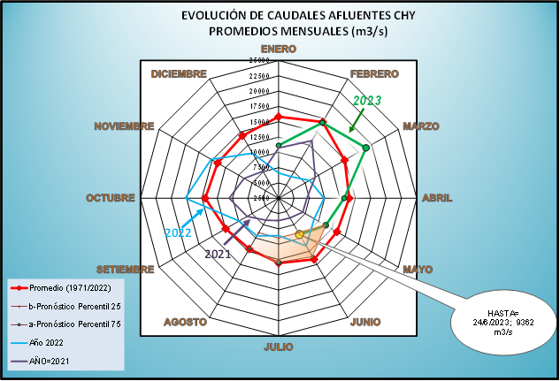Para el pronóstico hidrológico se considera la programación energética y las previsiones de caudales afluentes (medias diarias) que son realizadas teniendo en cuenta las condiciones actuales y pronósticos disponibles, que además están sujetas a revisión en función de eventuales cambios en las condiciones hidrometeorológicas (además de fenómenos localizados como el viento que se traduce en oleaje) y de las descargas de las Centrales Hidroeléctricas aguas arriba de la CHY.