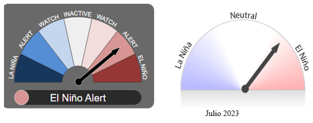 La Perspectiva ENSO está en Alerta El Niño. Cuando los criterios de Alerta de El Niño se han cumplido en el pasado, un evento de El Niño se ha desarrollado alrededor del 70% del tiempo.