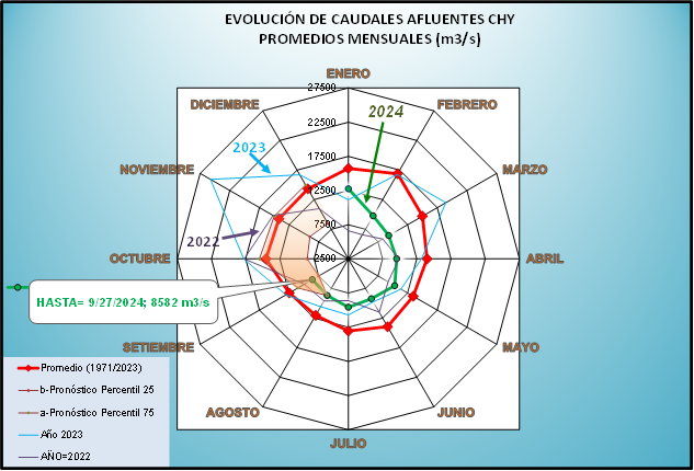 El caudal afluente a la CHY diario, pronosticado para la fecha de hoy es de 9.800 m3/s, y para el día de mañana se espera una afluencia del orden de 10.000 m3/s.
