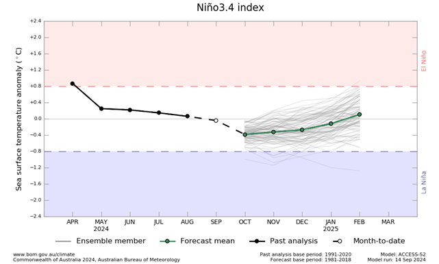 La Perspectiva ENSO se encuentra actualmente en ‘Vigilancia de La Niña’, lo que significa que hay algunas señales de que La Niña podría formarse en el Océano Pacífico más adelante en 2024. Los indicadores atmosféricos y oceánicos se encuentran actualmente dentro de los umbrales neutrales de ENSO.