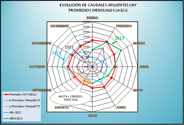 Para el pronóstico hidrológico se considera la programación energética y las previsiones de caudales afluentes (medias diarias) que son realizadas teniendo en cuenta las condiciones actuales y pronósticos disponibles, que además están sujetas a revisión en función de eventuales cambios en las condiciones hidrometeorológicas (además de fenómenos localizados como el viento que se traduce en oleaje) y de las descargas de las Centrales Hidroeléctricas aguas arriba de la CHY.