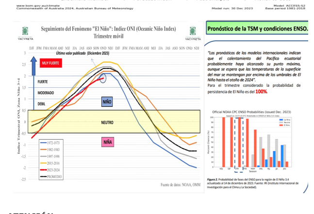 La evolución de índices climáticos publicados por organismos especializados de referencia, vinculados con la previsión del fenómeno caracterizado como “El Niño”, hace prever con un grado de probabilidad alto, que durante el periodo enero y marzo 2024 podrían verificarse eventos hidrológicos asociados a situaciones de aguas altas.