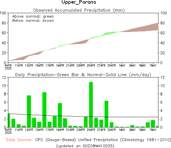 Para el trimestre considerado, se prevén valores inferiores a la normal en gran parte de la región oriental, mientras que en el resto del territorio nacional, se esperan condiciones normales.
