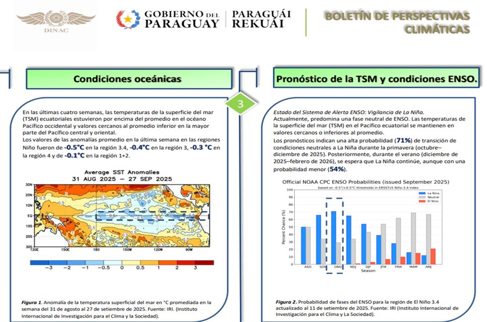 • Las observaciones en el océano Pacífico tropical han sido consistentes con condiciones de La Niña desde principios de octubre. El último valor relativo del índice de TSM Niño3.4 para la semana que finalizó el 23 de noviembre de 2025 fue de -0,93 °C. Los valores sostenidos por debajo de -0,8 °C son consistentes con un patrón de La Niña. Los valores semanales del índice relativo Niño3.4 han fluctuado alrededor del umbral de La Niña desde mediados hasta finales de septiembre.