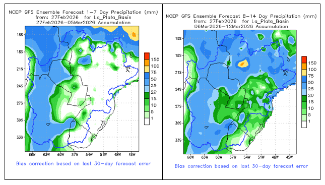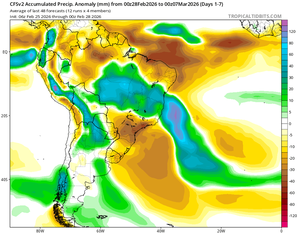 • Los vientos alisios en el Pacífico ecuatorial han sido cercanos o ligeramente más fuertes que el promedio en las últimas semanas. Los pronósticos de la Oscilación Madden-Julian sugieren que los vientos alisios podrían debilitarse en las próximas dos semanas, lo que podría contribuir a la ruptura del patrón de La Niña.