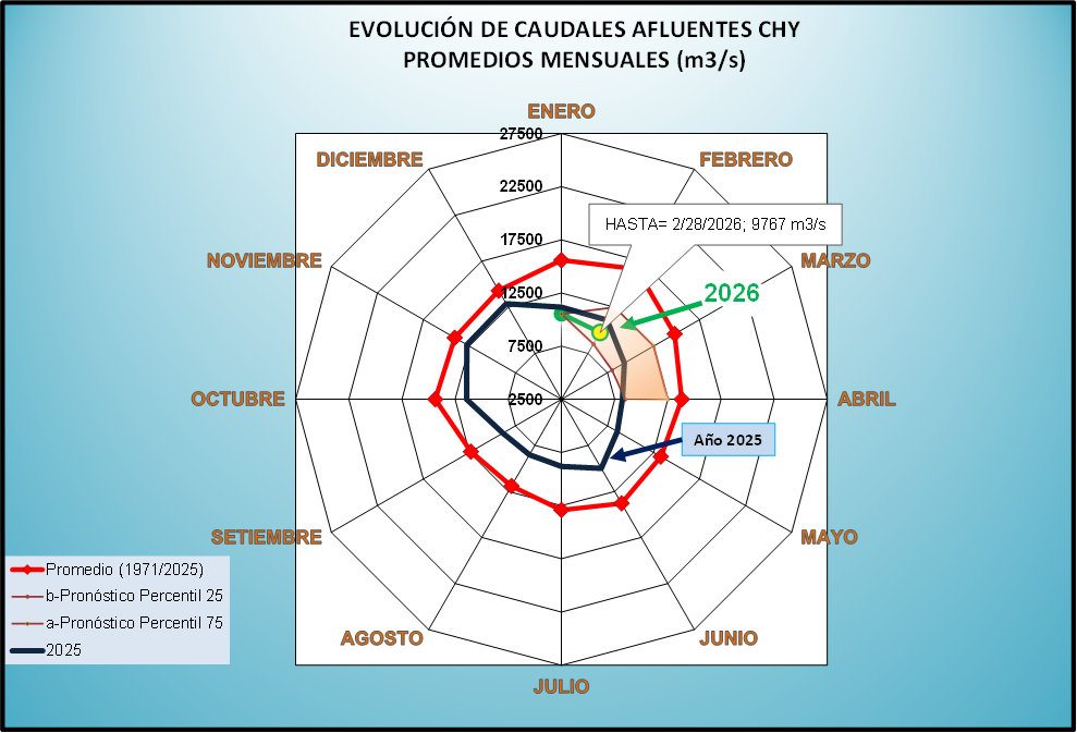 El caudal afluente a la CHY diario, pronosticado para la fecha de hoy es de 9.800 m3/s, y para el día de mañana se espera una afluencia del orden de 9.200 m3/s.