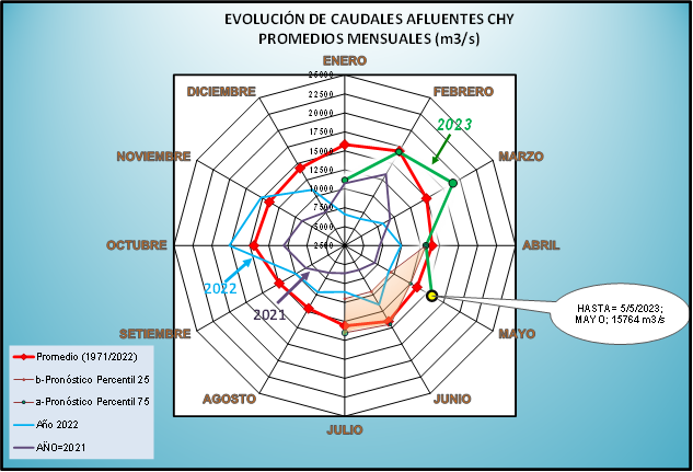 El caudal afluente a la CHY diario, pronosticado para la fecha de hoy es de 16.500 m3/s, y para el día de mañana se espera una afluencia del orden de 15.00 m3/s.