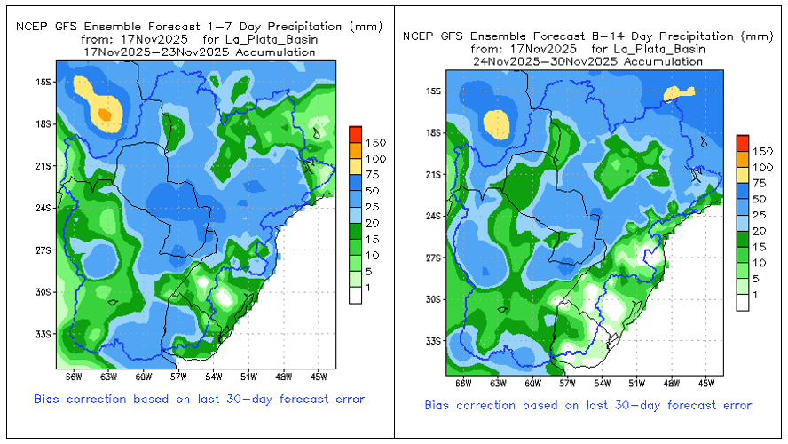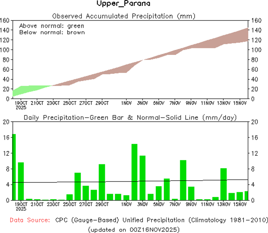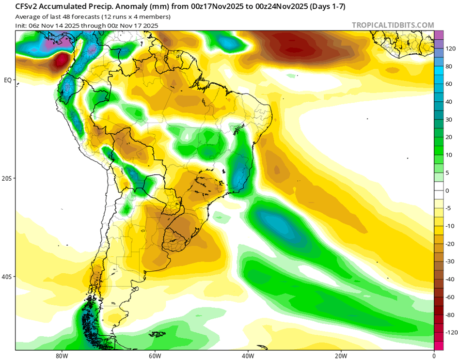 El índice del Modo Anular del Sur (SAM) es negativo al 25 de octubre. Se prevé que aumente en los próximos días hasta alcanzar niveles neutrales y que se mantenga así durante al menos las próximas dos semanas.
