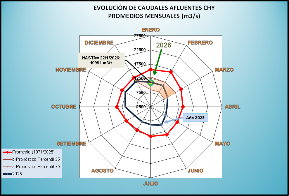 El caudal afluente a la CHY diario, pronosticado para la fecha de hoy es de 10.500 m3/s, y para el día de mañana se espera una afluencia del orden de 10.200 m3/s.