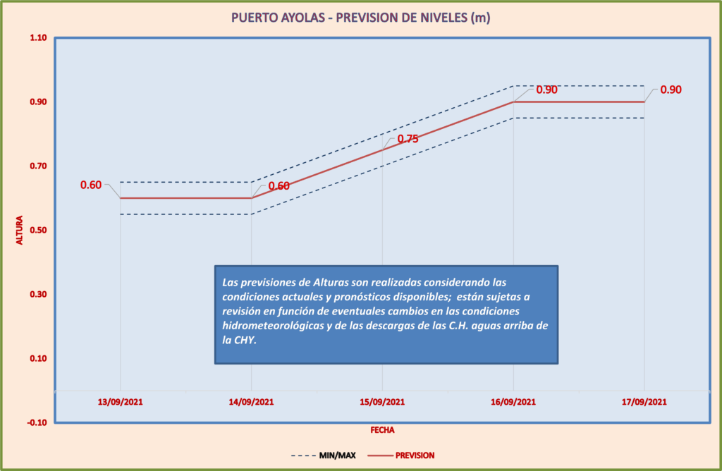 Las previsiones de Alturas son realizadas considerando las condiciones actuales y pronósticos disponibles y están sujetas a revisión en función de eventuales cambios en las condiciones hidrometeorológicas y de las descargas de las C.H. aguas arriba de la CHY.