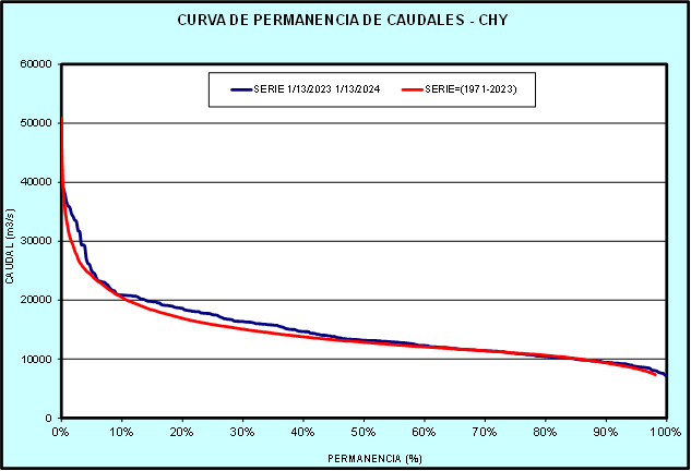El caudal afluente a la CHY diario, pronosticado para la fecha de hoy es de 11.800 m3/s, y para el día de mañana se espera una afluencia del orden de 11.500 m3/s.
