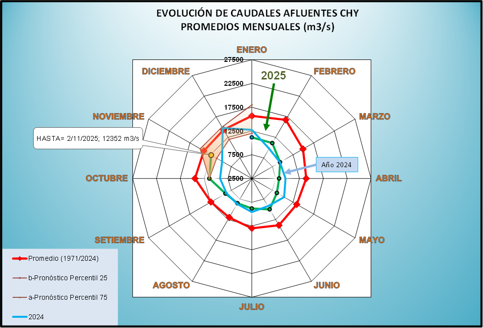 El caudal afluente a la CHY diario, pronosticado para la fecha de hoy es de 13.000 m3/s, y para el día de mañana se espera una afluencia del orden de 14.000 m3/s.