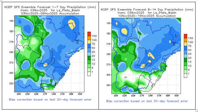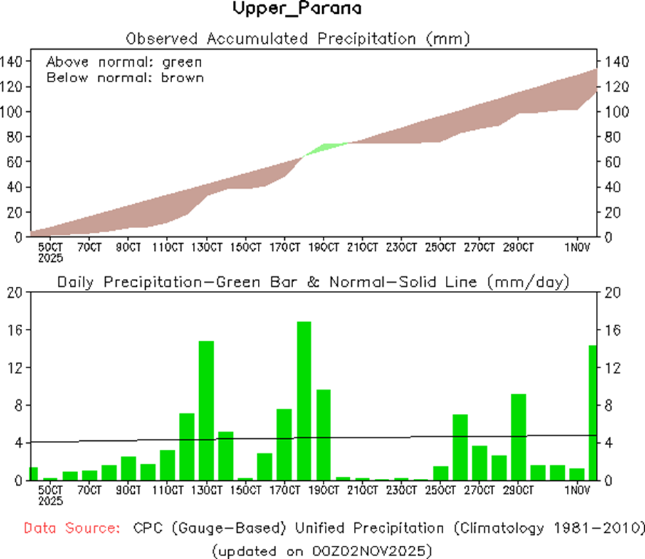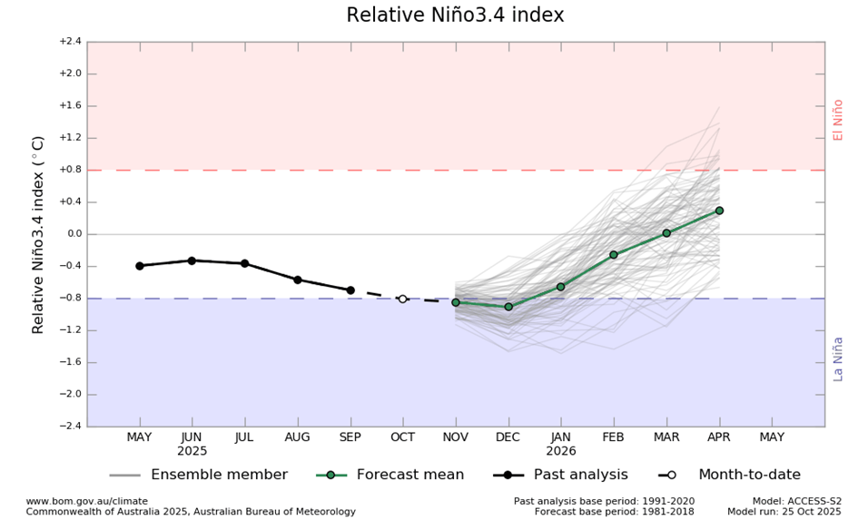 El Niño-Oscilación del Sur (ENOS) se mantiene neutral. El último valor relativo del índice de TSM de Niño3.4 para la semana que finalizó el 12 de octubre de 2025 fue de -0,79 °C. En las dos semanas anteriores, el índice de Niño3.4 cayó por debajo de -0,8 °C. Los valores entre -0,8 °C y +0,8 °C se consideran neutrales respecto al ENOS, mientras que los valores sostenidos por debajo de -0,8 °C (durante al menos tres meses) se consideran indicativos de La Niña.