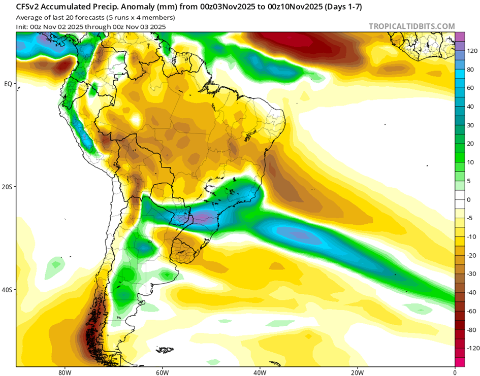 El índice del Modo Anular Sur (SAM) se encuentra en valores neutrales al 11 de octubre. Se prevé que caiga brevemente a valores negativos la próxima semana antes de volver a valores neutrales.