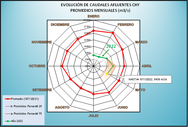 El caudal afluente a la CHY diario, pronosticado para la fecha de hoy es de 8.500 m3/s, y para el día de mañana se espera una afluencia del orden de 8.800 m3/s.