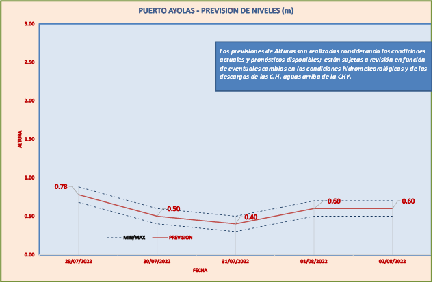 Las previsiones de Alturas son realizadas considerando las condiciones actuales y pronósticos disponibles y están sujetas a revisión en función de eventuales cambios en las condiciones hidrometeorológicas y de las descargas de las C.H. aguas arriba de la CHY.