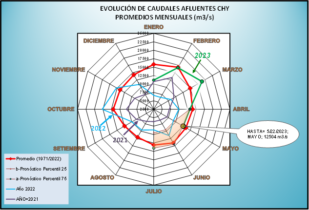 El caudal afluente a la CHY diario, pronosticado para la fecha de hoy es de 8.800 m3/s, y para el día de mañana se espera una afluencia del orden de 9.000 m3/s.