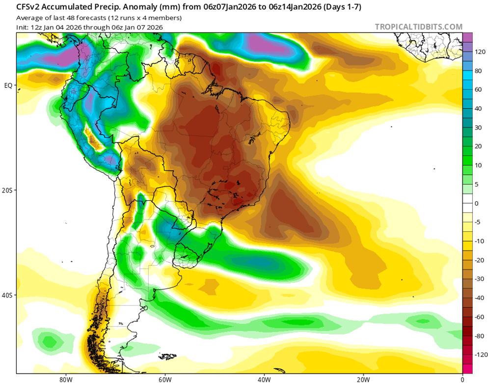 • El índice del Modo Anular Sur (SAM) se mantiene neutral al 3 de enero de 2026. Se prevé que se mantenga prácticamente neutral durante las próximas dos semanas. Posteriormente, existen diversos resultados posibles, lo que implica una menor claridad en la probable fase del SAM.