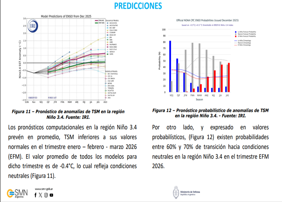 • La Niña continúa en el Pacífico tropical. El último valor relativo del índice de temperatura superficial del mar (TSM) Niño3.4 para la semana que finalizó el 4 de enero de 2026 fue de -0,95 °C. Los valores sostenidos por debajo de -0,80 °C son consistentes con un patrón de La Niña. Los valores semanales del índice relativo Niño3.4 han fluctuado alrededor del umbral de La Niña desde mediados hasta finales de septiembre.