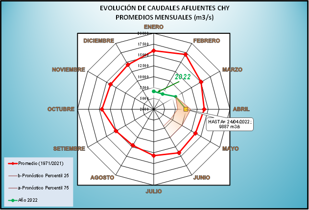 El caudal afluente a la CHY diario, pronosticado para la fecha de hoy es de 8.000 m3/s, y para el día de mañana se espera una afluencia del orden de 7.800 m3/s.