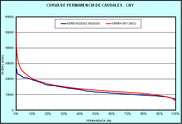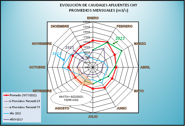 El caudal afluente a la CHY diario, pronosticado para la fecha de hoy es de 11.800 m3/s, y para el día de mañana se espera una afluencia del orden de 12.400 m3/s.