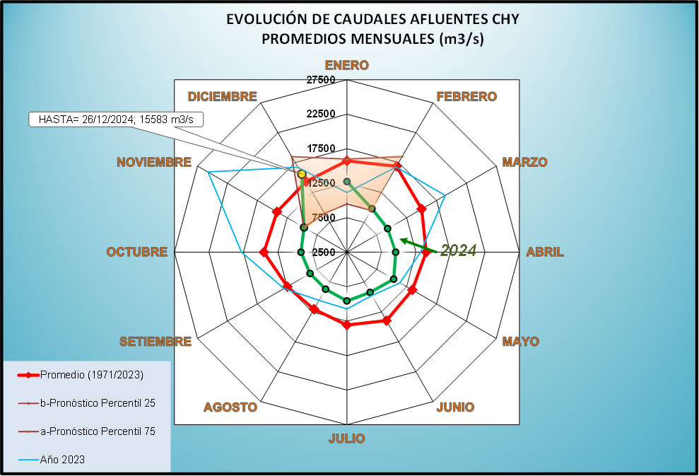 El caudal afluente a la CHY diario, pronosticado para la fecha de hoy es de 10.700 m3/s, y para el día de mañana se espera una afluencia del orden de 11.100 m3/s.