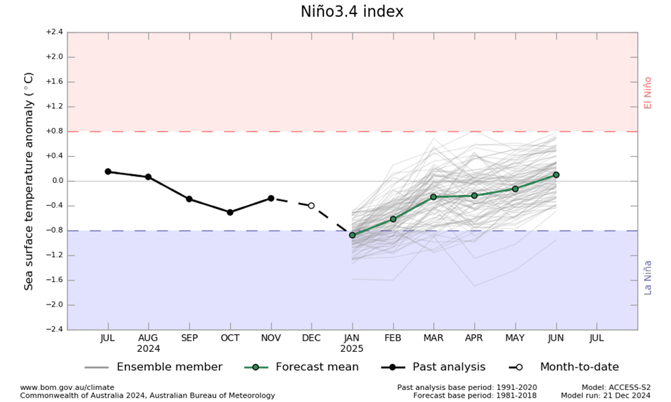 El modelo de la Oficina sugiere que es probable que las temperaturas de la superficie del mar permanezcan dentro de los umbrales neutrales del ENSO (-0,8 °C a +0,8 °C) durante todo el período de pronóstico hasta febrero de 2025.