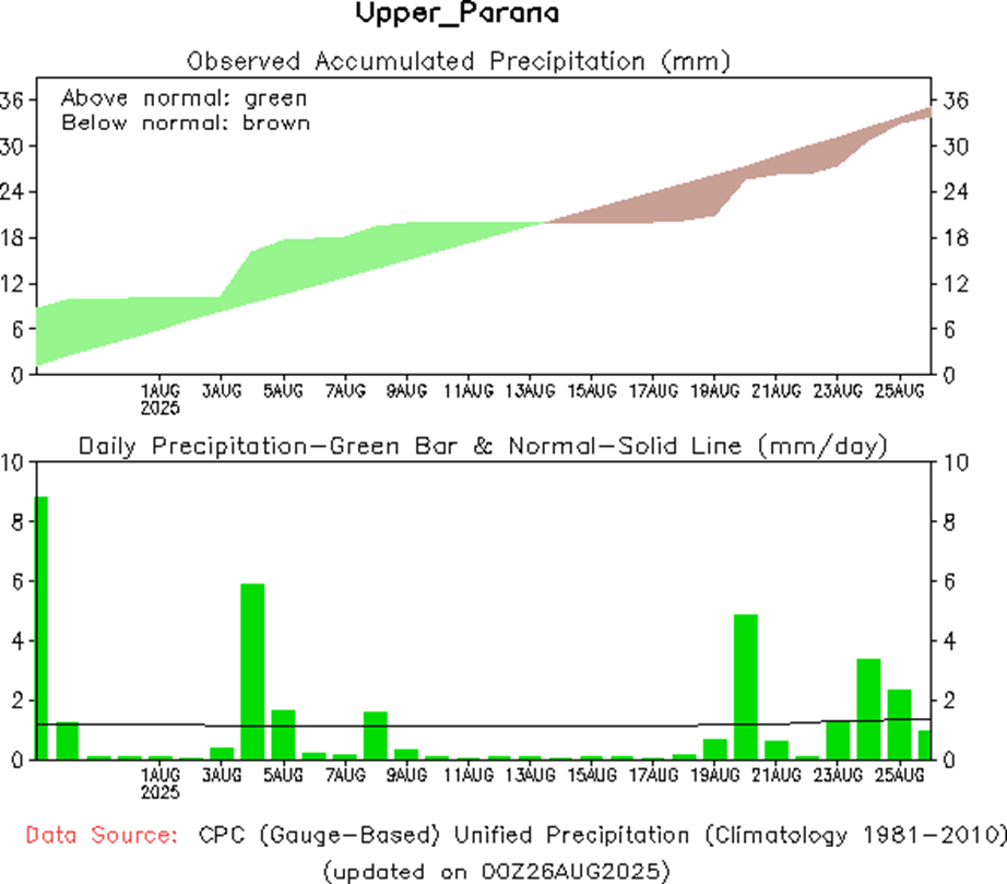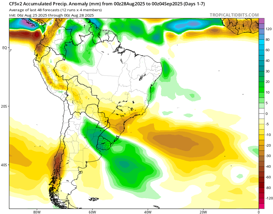 El fenómeno de El Niño-Oscilación del Sur (ENOS) se mantiene neutral. El último valor de El Niño 3.4 para la semana que finalizó el 10 de agosto es de -0,12 °C. Los valores neutrales de El Niño 3.4 se encuentran entre -0,8 °C y +0,8 °C.