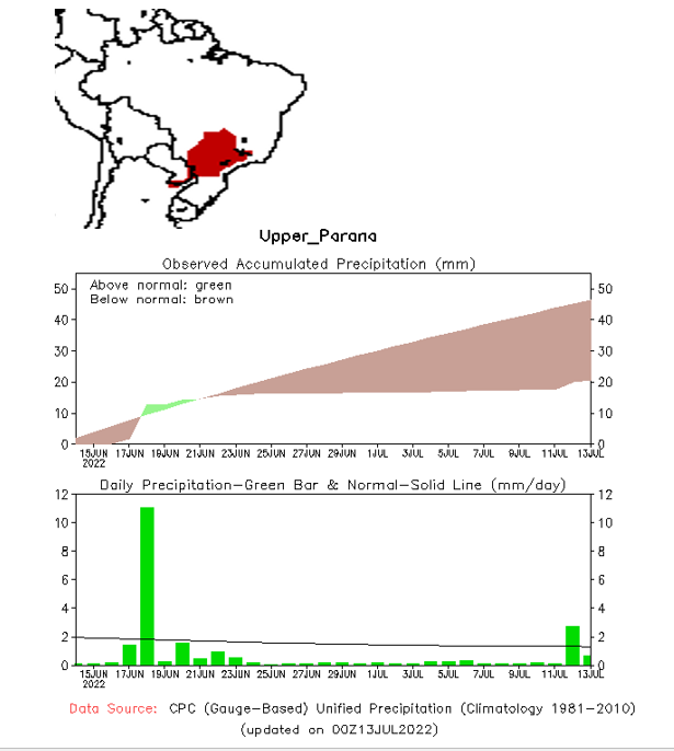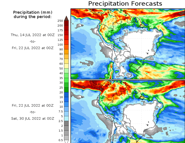 El pronóstico Hidrometeorológico del Centro Climático de referencia indica una tendencia semanal de poca significancia hidrológica en la cuenca de interés para la CHY con dispersión geográfica según sea la fuente consultada. (Ver gráfico Nro. 1).