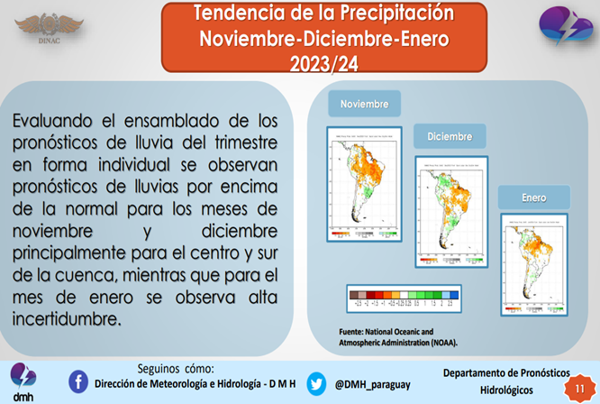 La evolución de índices climáticos publicados por organismos especializados de referencia, vinculados con la previsión del fenómeno caracterizado como “El Niño”, hace prever con un grado de probabilidad alto, que durante el semestre octubre 23 – marzo 24 podrían verificarse eventos hidrológicos asociados a situaciones de aguas altas.
