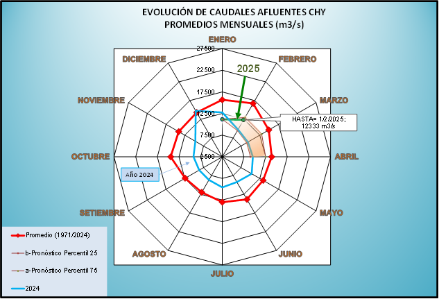 El caudal afluente a la CHY diario, pronosticado para la fecha de hoy es de 11.700 m3/s, y para el día de mañana se espera una afluencia del orden de 10.800 m3/s.