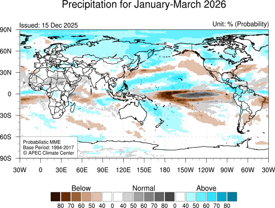 La Niña continúa en el Pacífico tropical. El último valor relativo del índice de temperatura superficial del mar (TSM) Niño3.4 para la semana que finalizó el 4 de enero de 2026 fue de -0,95 °C. Los valores sostenidos por debajo de -0,80 °C son consistentes con un patrón de La Niña. Los valores semanales del índice relativo Niño3.4 han fluctuado alrededor del umbral de La Niña desde mediados hasta finales de septiembre.