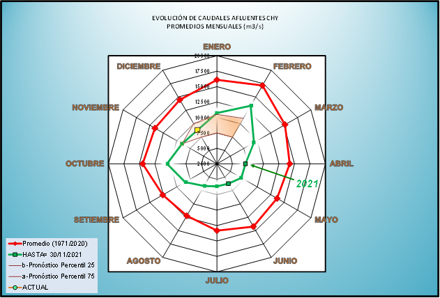 Para el pronóstico hidrológico se considera la programación energética y las previsiones de caudales afluentes (medias diarias) que son realizadas teniendo en cuenta las condiciones actuales y pronósticos disponibles, que además están sujetas a revisión en función de eventuales cambios en las condiciones hidrometeorológicas (además de fenómenos localizados como el viento que se traduce en oleaje) y de las descargas de las Centrales Hidroeléctricas aguas arriba de la CHY.