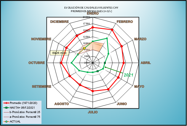 El caudal afluente a la CHY diario, pronosticado para la fecha de hoy es de 7.700 m3/s, y para el día de mañana se espera una afluencia del orden de 7.800 m3/s.