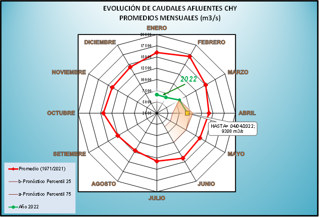 El caudal afluente a la CHY diario, pronosticado para la fecha de hoy es de 8.200 m3/s, y para el día de mañana se espera una afluencia del orden de 8.200 m3/s.