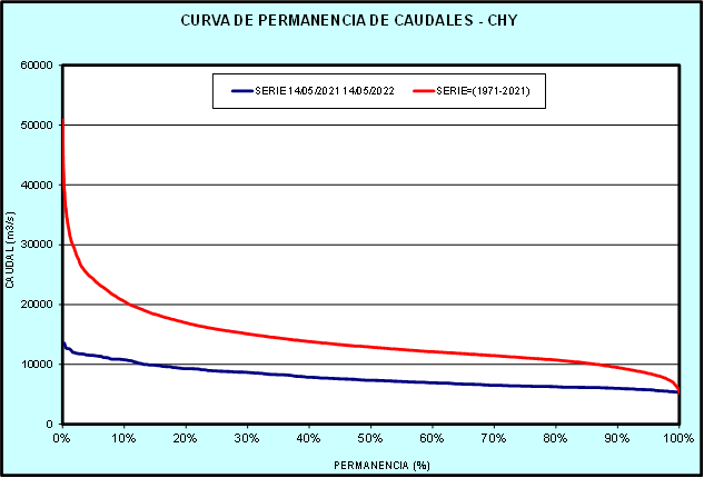 El caudal afluente a la CHY diario, pronosticado para la fecha de hoy es de 9.000 m3/s, y para el día de mañana se espera una afluencia del orden de 8.400 m3/s.