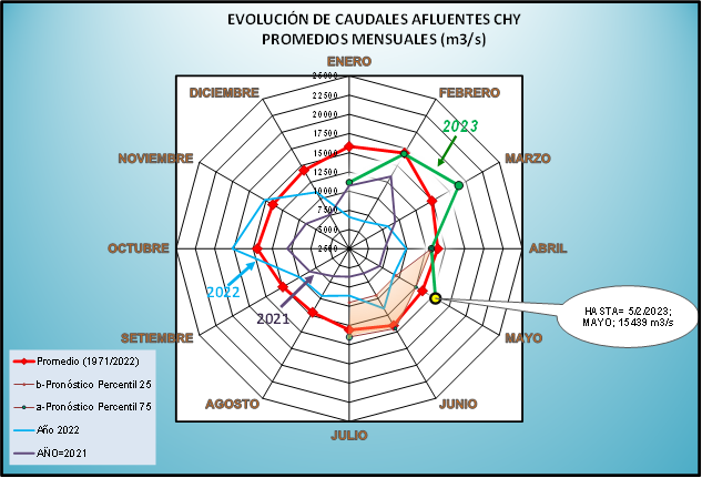 El caudal afluente a la CHY diario, pronosticado para la fecha de hoy es de 15.700 m3/s, y para el día de mañana se espera una afluencia del orden de 15.700 m3/s.