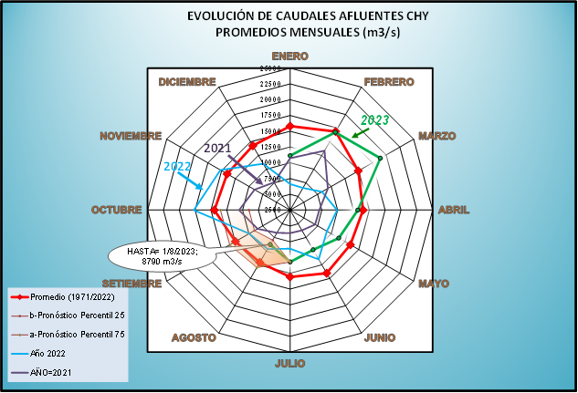El caudal afluente a la CHY diario, pronosticado para la fecha de hoy es de 9.500 m3/s, y para el día de mañana se espera una afluencia del orden de 10.400 m3/s.