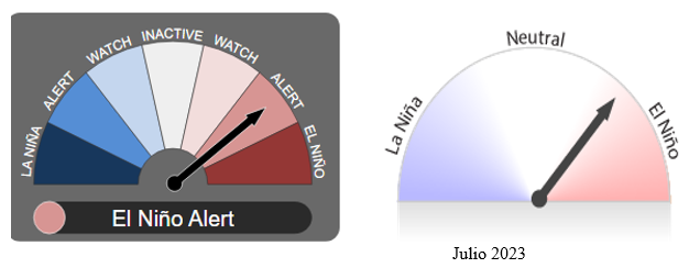 La Perspectiva ENSO está en Alerta El Niño. Cuando los criterios de Alerta de El Niño se han cumplido en el pasado, un evento de El Niño se ha desarrollado alrededor del 70% del tiempo.