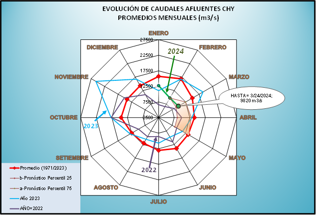 El caudal afluente a la CHY diario, pronosticado para la fecha de hoy es de 7.600 m3/s, y para el día de mañana se espera una afluencia del orden de 7.400 m3/s.