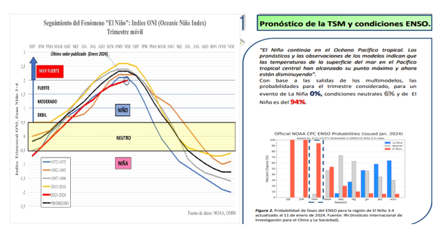 La evolución de índices climáticos publicados por organismos especializados de referencia, vinculados con la previsión del fenómeno caracterizado como “El Niño”, hace prever con un grado de probabilidad alto, que durante el periodo enero y marzo 2024 podrían verificarse eventos hidrológicos asociados a situaciones de aguas altas.